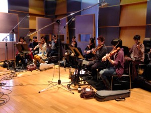 午前中からレコーディングです。リズム楽器の後、ハープや金管、木管楽器を録り、最後に弦楽器です。今日は金原千恵子さんのストリングスチームでヴァイオリンのみの10人編成。やはり生楽器の録音は本当に楽しいですよ!