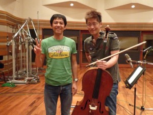 今日はチェロのレコーディング、名プレーヤー堀沢真己さん(右)です。素晴らしいプレイ、本当に良い音でした!左はワタシ、アレンジャーというより観客気分でしたよ。