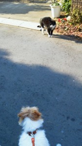 猫好きのシマちゃん、今日はちょっと離れてお見合いです。最初はおとなしく睨み合い(シマはシッポ振ってる)、その後ネコさんはご機嫌斜めで去って行きましたとさ。