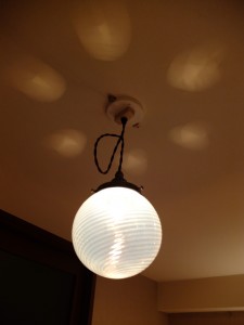 セールになっていたとアンティーク(らしい)の照明を妻が買ってきましたよ。クリスマスの時にオブジェがついていた所につけてみました。何かレトロな雰囲気だなあ。子供の頃の風呂場がこんな感じじゃなかったかな。