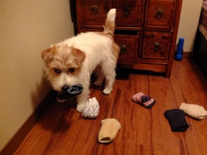 ちょっと前の写真。タンスの把っ手を口で引っぱって開けて、靴下を中から出して遊んでいます。これをくわえて逃げるのですが、追っかけて欲しいんだよね、シマちゃん。