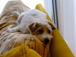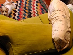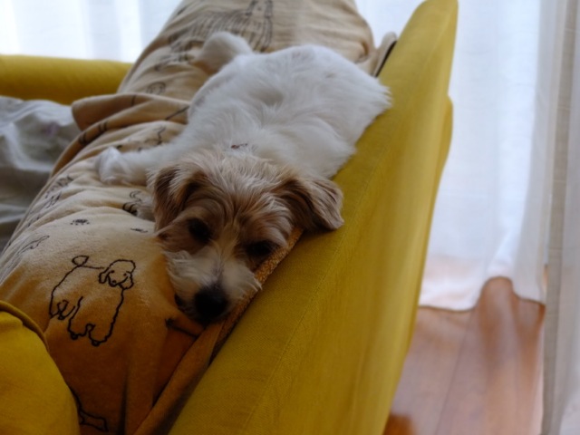 リビングルームへ戻って来たらソファーがバラバラ。雨で外に出られず発狂したシマちゃんは、この後散歩できて正気に戻りました。