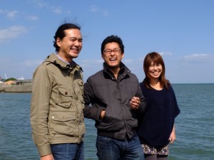 そしてチャンポン屋の前の海で記念撮影です。左からベース竹下欣伸、ドラム天倉正敬、チェロ今井カオリン。