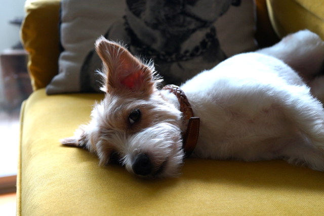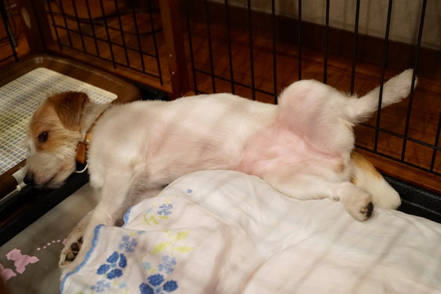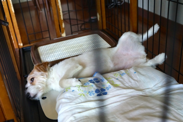 シマちゃんはまたこのポーズ。足をひっかけるのが気持ちいい気持ちがよくわかる。このところ毎日譜面書きなので犬ネタが続いてます。