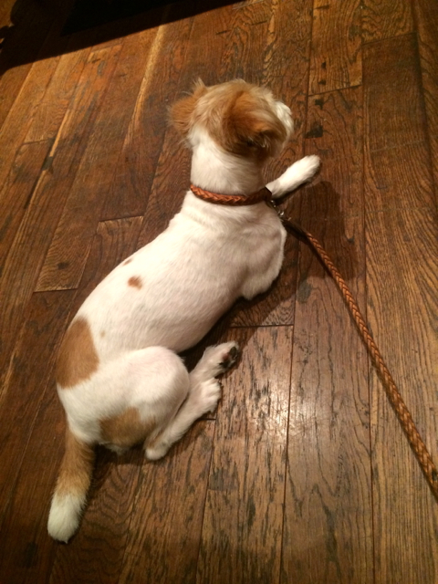 夕べの写真。犬も入れてくださる近所のレストランでの食事中、ひたすらお店の方が来てくれるのを待ってるの図。いつもシマちゃんに、めちゃ美味そう&どう見ても高級食材を食べさせてくれるので、聞いた事ない声を出してアピールします。「ワタシ居ますよ〜ん、待ってますよ〜ん、わお〜ん」て感じで。