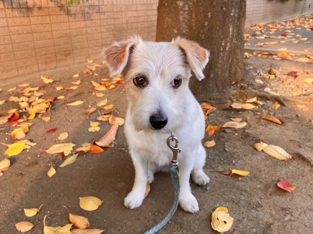 落ち葉が目立ってきました。この季節のお約束で記念撮影。なかなかカメラ目線にならない。