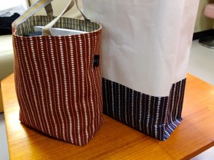 奈緒さんのリハーサルに出かけるのに紙袋を、と思いたまたま取り出したのがこの袋(右)。偶然機材用に使っていたブラウンの袋(左)を買った時の紙袋だったのでお揃いの模様。浜町高虎さんの江戸模様袋です。