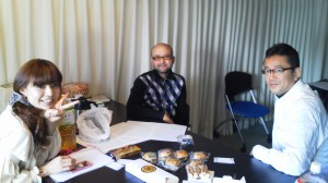 Kuuさんのレコーディングにて。左からKuuさん、ギターの古川昌義さん、プロデューサーの服部さん。服部さんは僕の大学時代の先輩で卒業20数年目にして初仕事です。先輩、お世話になります!机の上は、まい泉三昧。